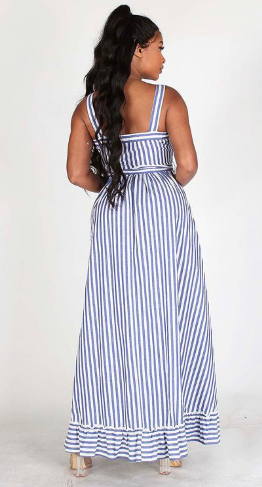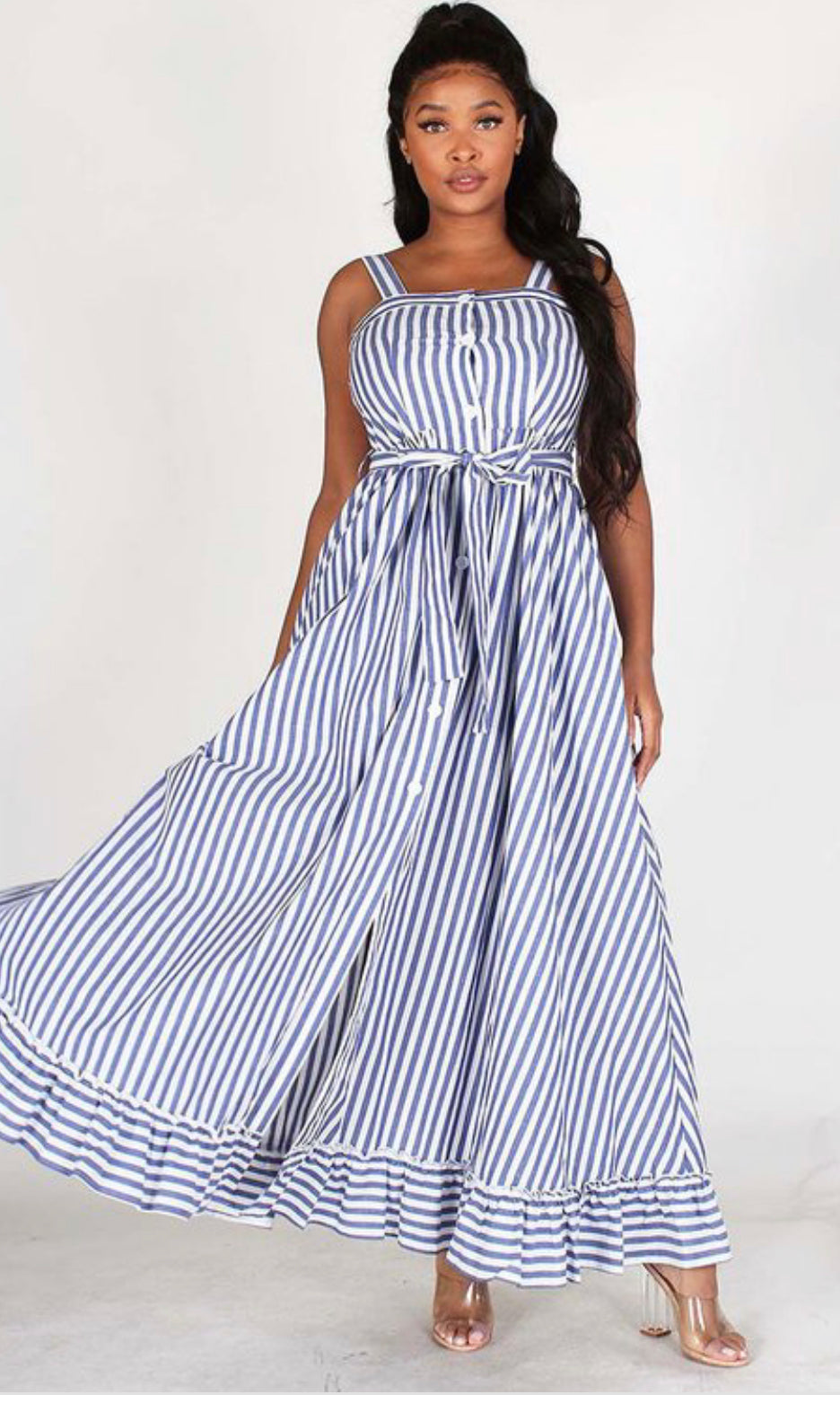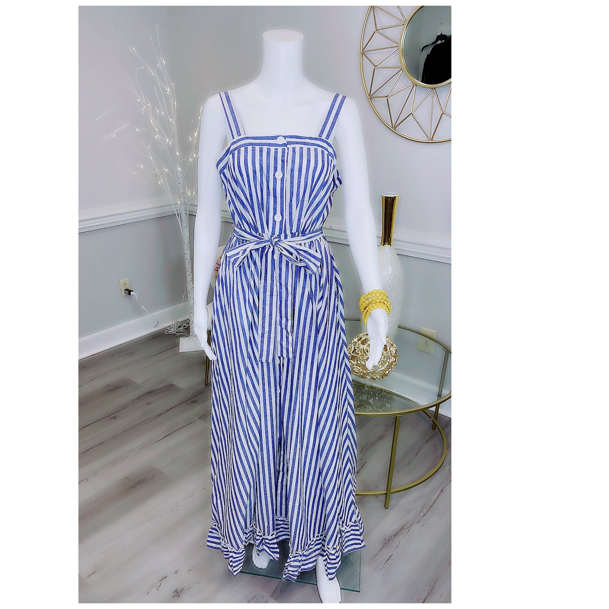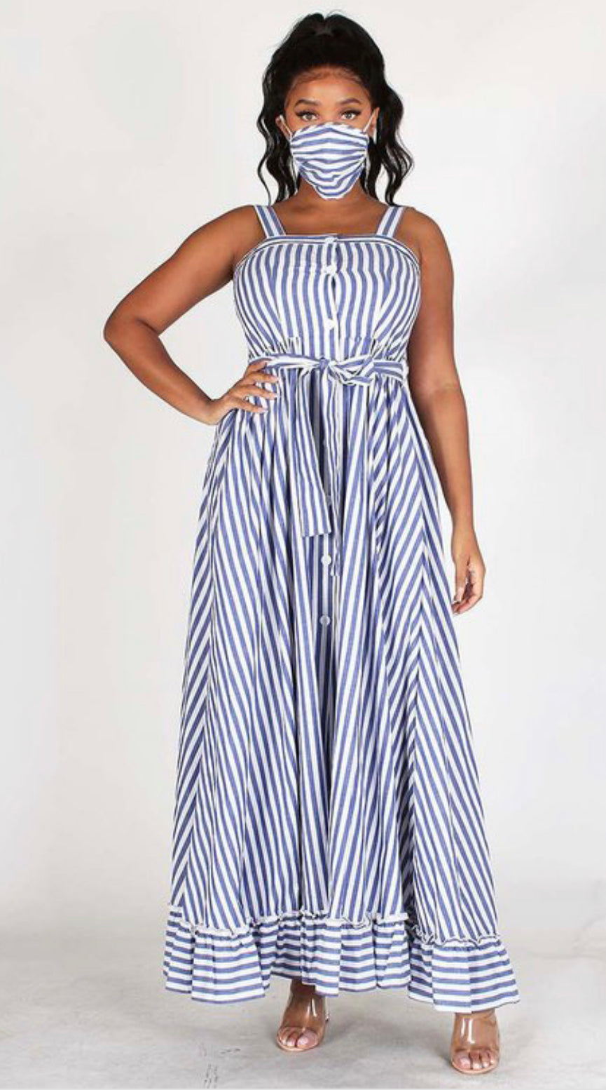 Sleeveless spaghetti strap button down elastic waist maxi dress with stripes, pockets, belt and matching mask