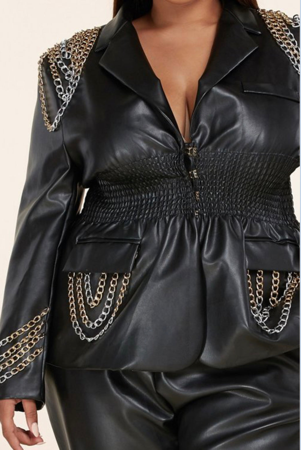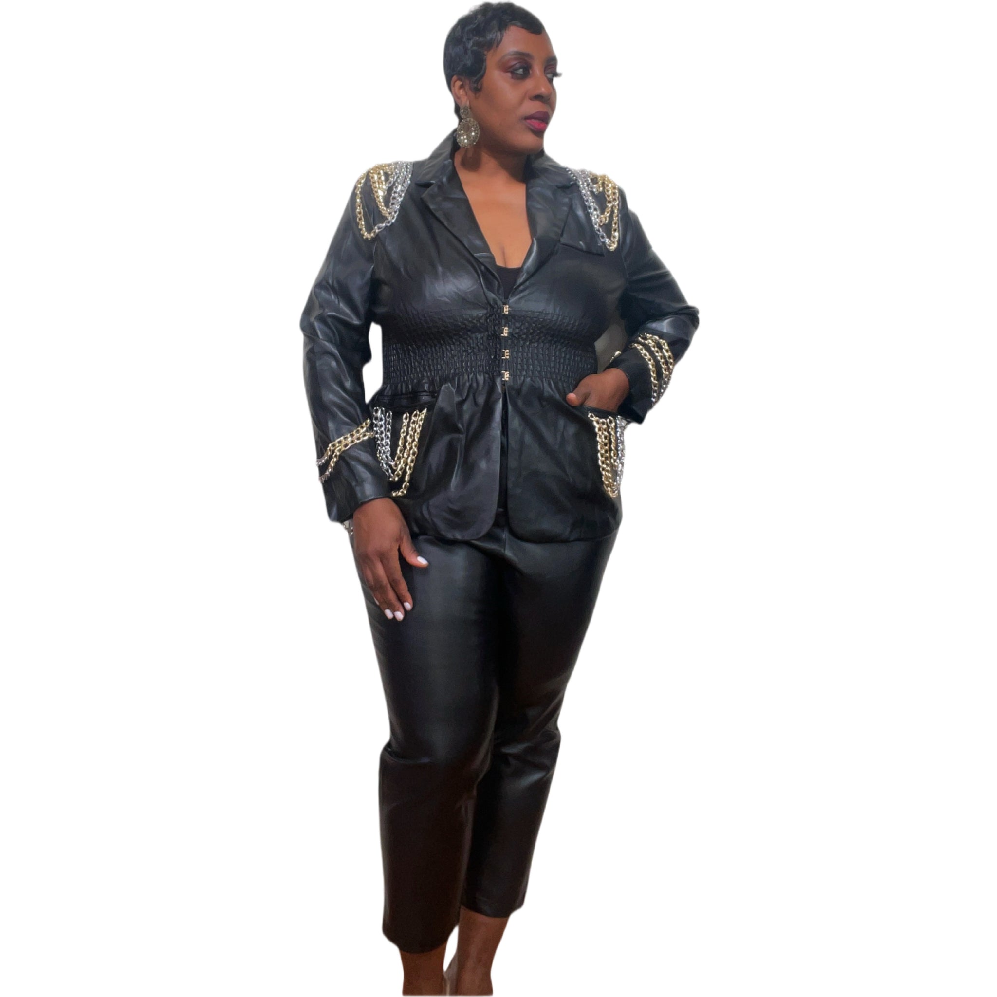 Two piece set with pants and top. Pants feature zipper and hook closure with side pockets. Top has gold and silver chain details, two front pockets,4 hook closure V neck and collar. Fits true to size